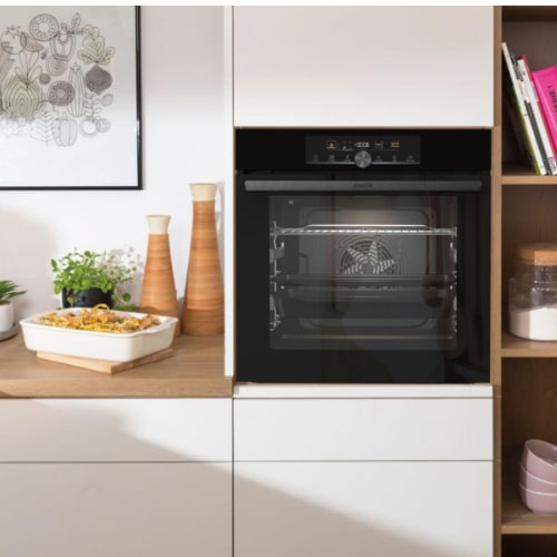 תנור בנוי עם תוכנית אדים בנפח 77 ליטר גימור זכוכית שחורה מבית gorenje דגם BOS6747A01BG