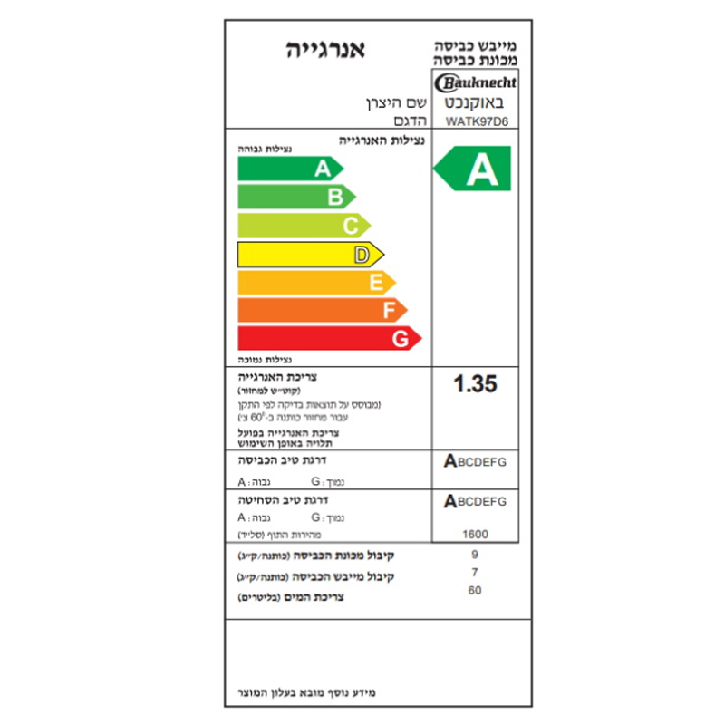 מכונת כביסה משולב מייבש מבית BAUKNECHT באוקנכט דגם WATKSENSE 97D6IL
