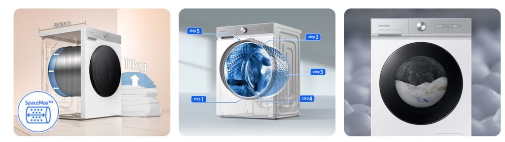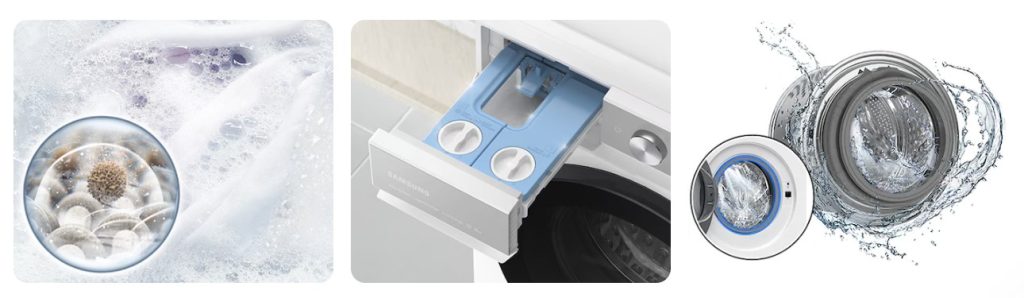 AI מזהה את כמות הכביסה ובלעדי לסמסונג את רמת הלכלוך ולפי זה מזרימה את כמות החומר ניקוי הנדרשת ל כל כביסה, המערכת חוסכת בדטרגנטים וזמן כביסה. מכונה בעלת טכנולוגיית AI הלומדת את הרגלי השימוש שלכם ומתאימה את התוכניות בהתאם