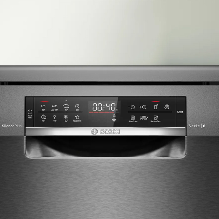 4 לחצנים: Remote start לשליטה מרחוק, EfficientDry – פתיחת דלת בסיום התכנית ליבוש מיטבי, intensiveZone – אזור ניקוי מוגבר בסלסלה התחתונה, +Speed Perfect להדחה מהירה של עד 66% מזמן הדחה רגילה, MachineCare – תכנית מיוחדת לשמירה על המדיח