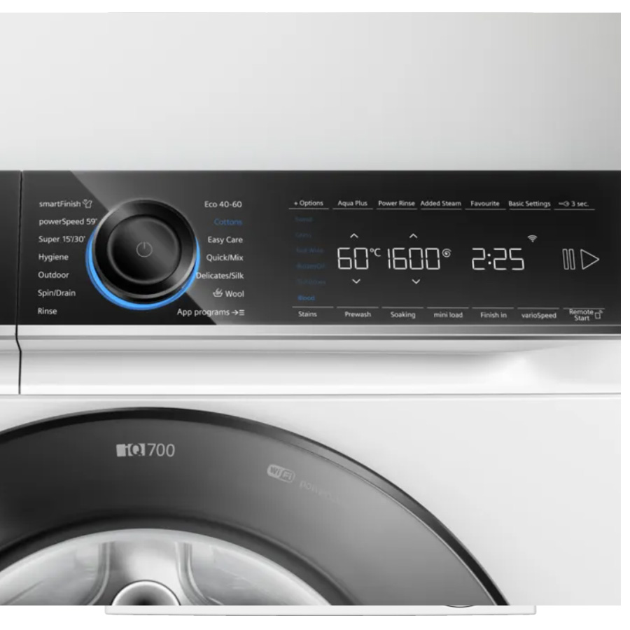 מסך מגע חדשני עם לחצני touchControl: הפעלה / reload , בורר טמפרטורה, בורר מהירות סחיטה, varioSpeed, בחירת כתם להסרה, טיימר להפעלה מאוחרת עד 24 שעות, Power Rinse ,AquaPlus, תכנית Favourite