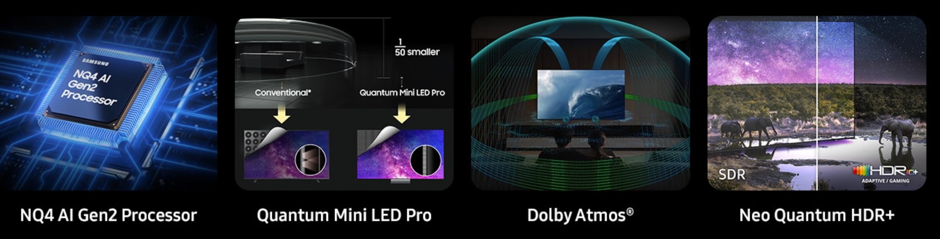 נוריות Quantum Mini LED Pro בטלוויזיות Neo QLED, בגודל הקטן פי 1/50 לעומת נוריות LED קונבנציונליות, מאפשרות בקרת אור מדויקת במיוחד המציגה בפרטי פרטים גם סצנות כהות וגם בהירות
