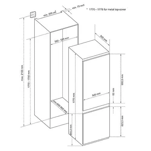מקרר משולב מקפיא תחתון בנוי מאפשר הצבה בקו בילד אין עם ארונות המטבח