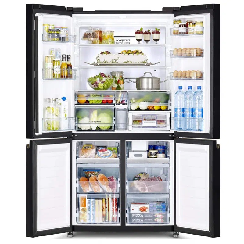 מקרר 4 דלתות מקפיא תחתון בגימור זכוכית כסופה כולל מנגנון שבת מובנה