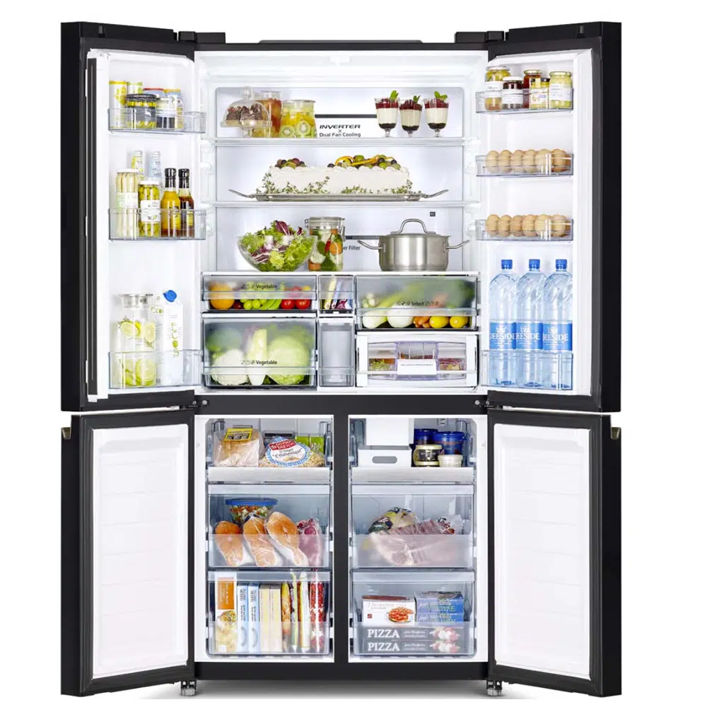 מקרר 4 דלתות מקפיא תחתון בגימור זכוכית כסופה כולל מנגנון שבת מובנה