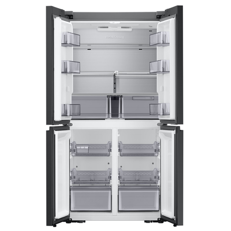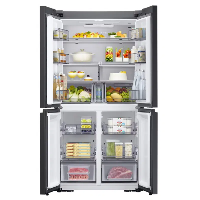 מקרר 4 דלתות – 636 ליטר Samsung סדרת BeSpoke היוקרתית, בעלת חזית זכוכית מחוסמת הניתנת להחלפה.