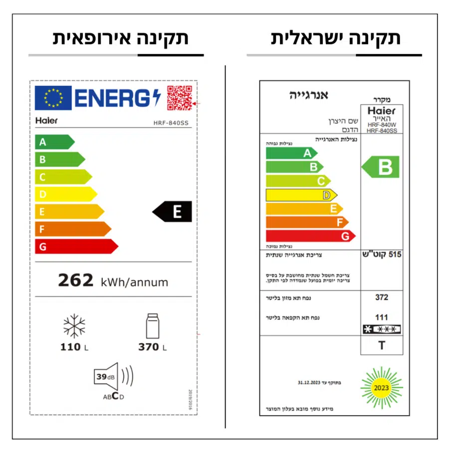 נפח תא מזון – תקינה ישראלית – 372 ליטר | תקינה אירופאית – 370 ליטר