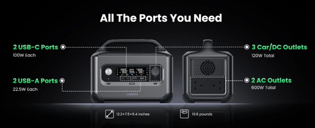 עד 13 מכשירים בו זמנית: ניתן לטעון 6 מכשירים בחיבור AC, 2 מכשירים בחיבור USB-C 100W, 2 מכשירים בחיבור USB-A, חיבור לרכב ו-2 חיבורי DC5521.