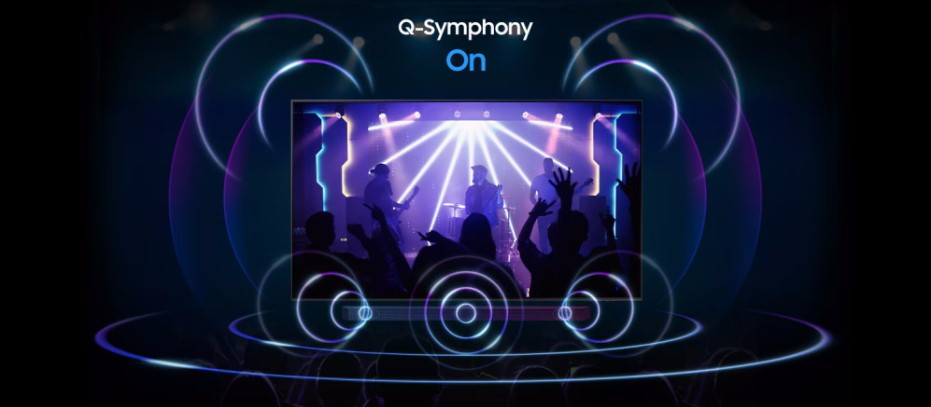 טכנולוגיית Q-Symphony מאפשרת לרמקולי הטלוויזיה והסאונדבר לפעול בו-זמנית לאפקט סראונד טוב יותר, מבלי להשתיק את רמקולי הטלוויזיה
