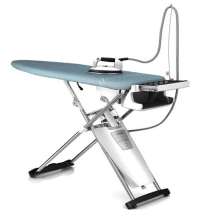 מערכת גיהוץ הכוללת מגהץ ודוד קיטור המחוברים לשולחן פונקציונלי מתקדם