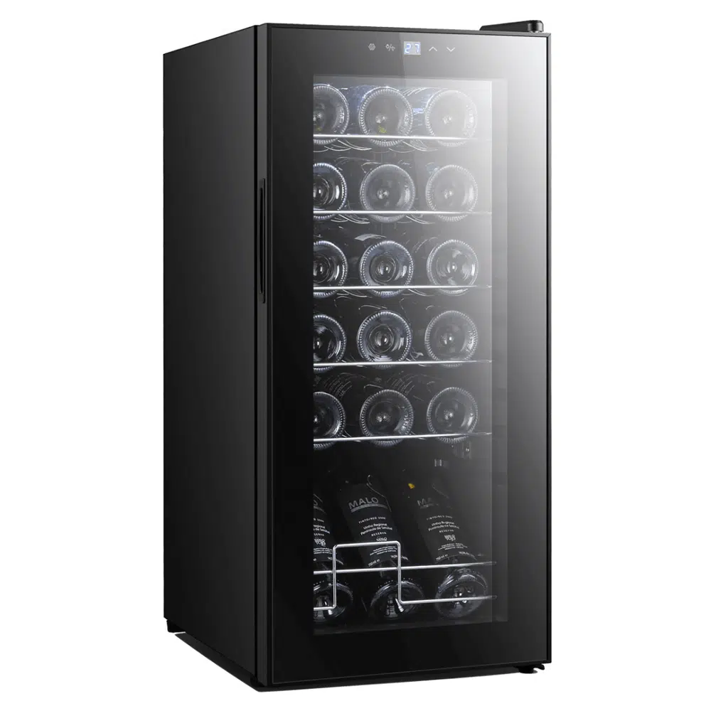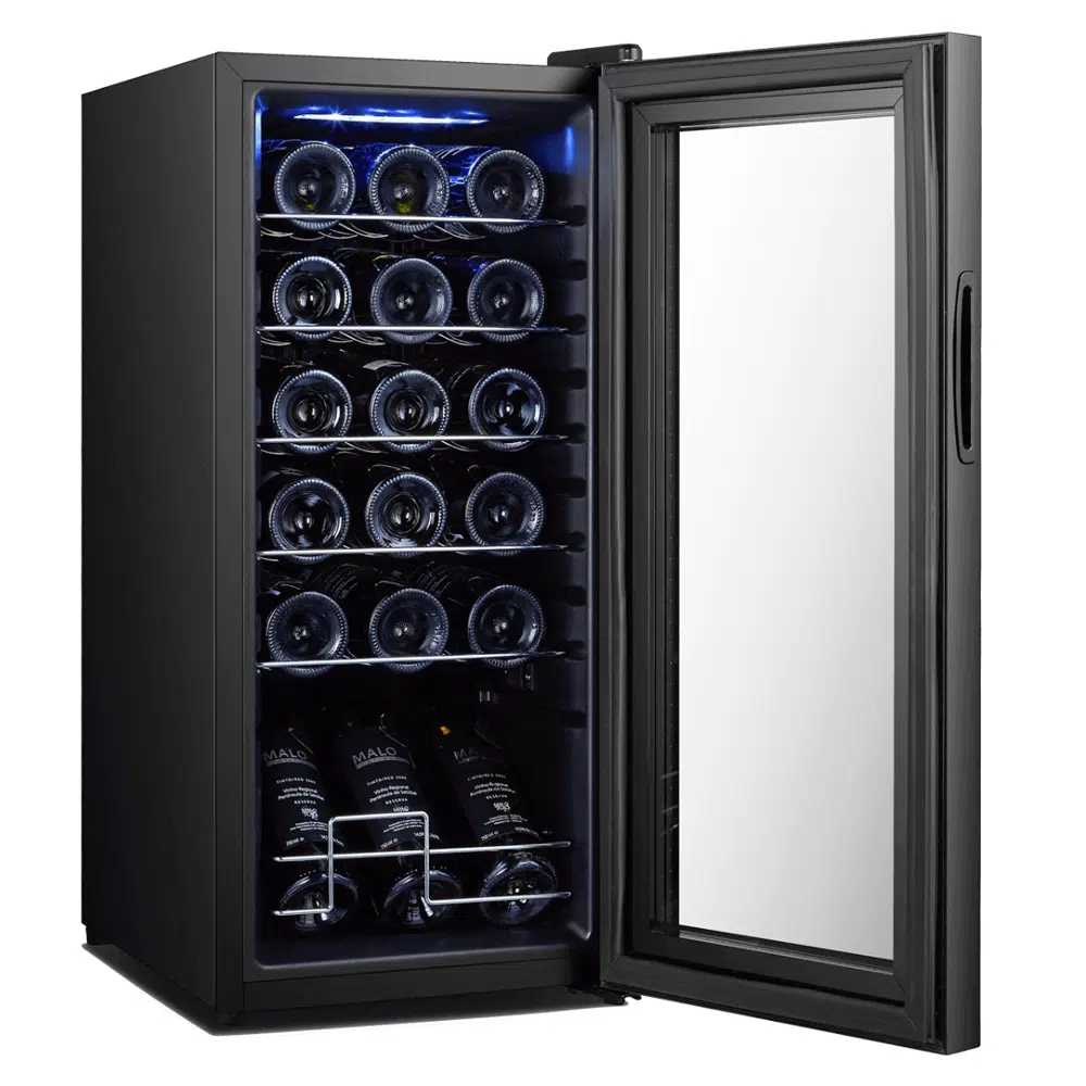 מקרר יין עם מדפי נירוסטה המיועד לאחסון 18 בקבוקים של יין אדום או לבן.
