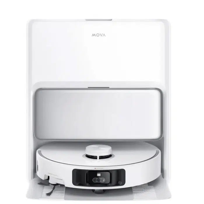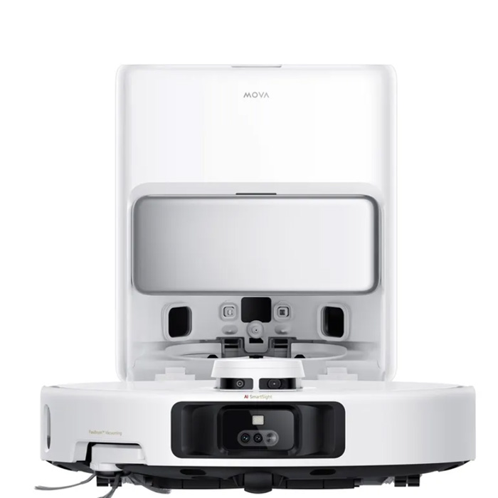 תחנת עגינה חכמה לניקוי עצמי – המגב והקרש נשטפים במים חמים (75°), ריקון אוטומטי של האבק עד 75 ימים, מילוי מים נקיים, חיטוי המגב וייבושו באוויר חם (45°).