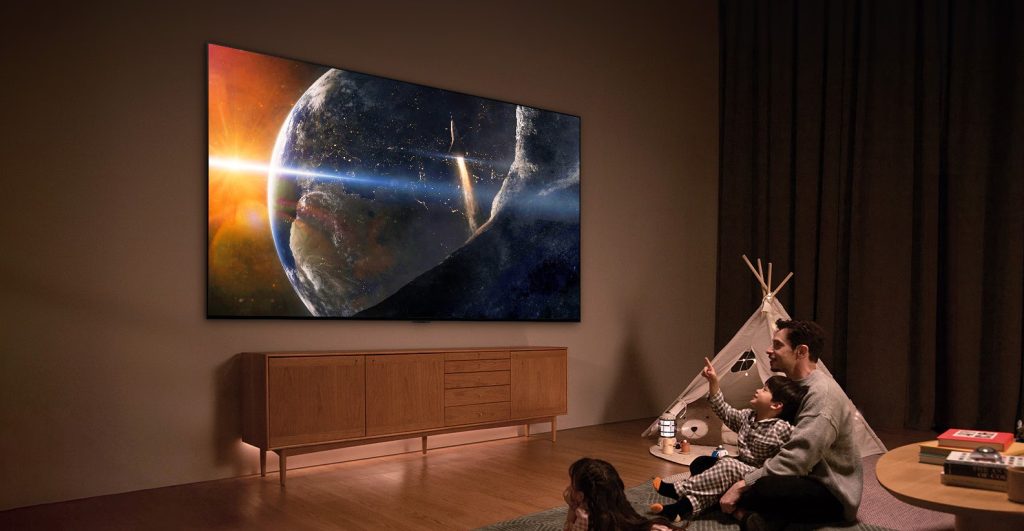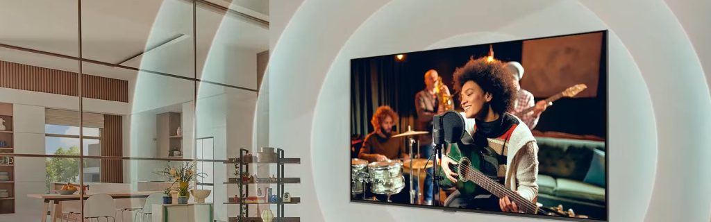 AI Acoustic tuning: בנגיעה אחת בלבד השלט החכם והטלוויזיה יכולים לבצע איזון קולי אופטימלי ע”י זיהוי מיקום הטלוויזיה בתוך החדר ומיקסום אפקט הצליל ההיקפי