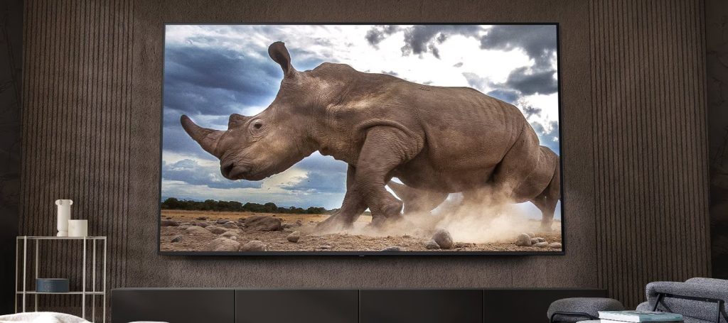 קרנף בספארי מוצג על גבי טלוויזיה גדולה במיוחד של LG, שמותקנת על קיר חום בסלון שמלא ברהיטים מודולריים בצבע שמנת.